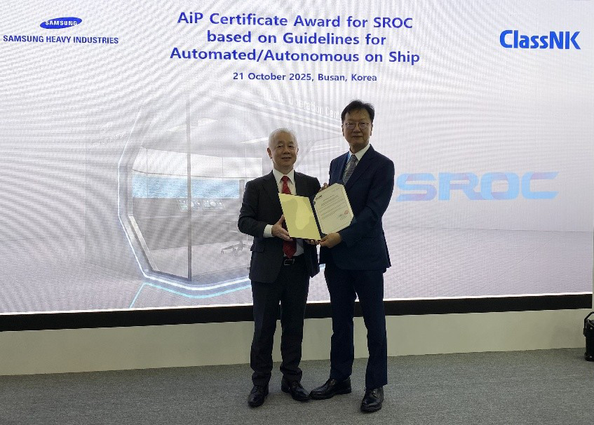 Tokyo - ClassNK has issued an Approval in Principle (AiP) for “Samsung Remote Operation Center (SROC)”, a shore-based remote monitoring system developed by Samsung Heavy Industries Co., Ltd., and a certificate handover ceremony was held in KORMARINE 2025.