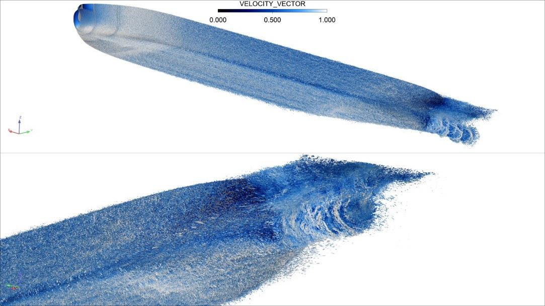 (注1)現在、活用されているCFD技術であるRANS(Reynolds-Averaged Navier-Stokes)は、乱流を平均化して扱うことで、数百万〜数千万要素程度の比較的軽い計算で船体まわりの流れを予測する手法です。一方、超高精度CFD技術であるLES(Large Eddy Simulation)は、乱流の微小な渦構造まで直接解像する手法のため、数百億要素程度の大規模計算が必要になりますが、その分、流れ場や抵抗の予測精度は大きく向上します。