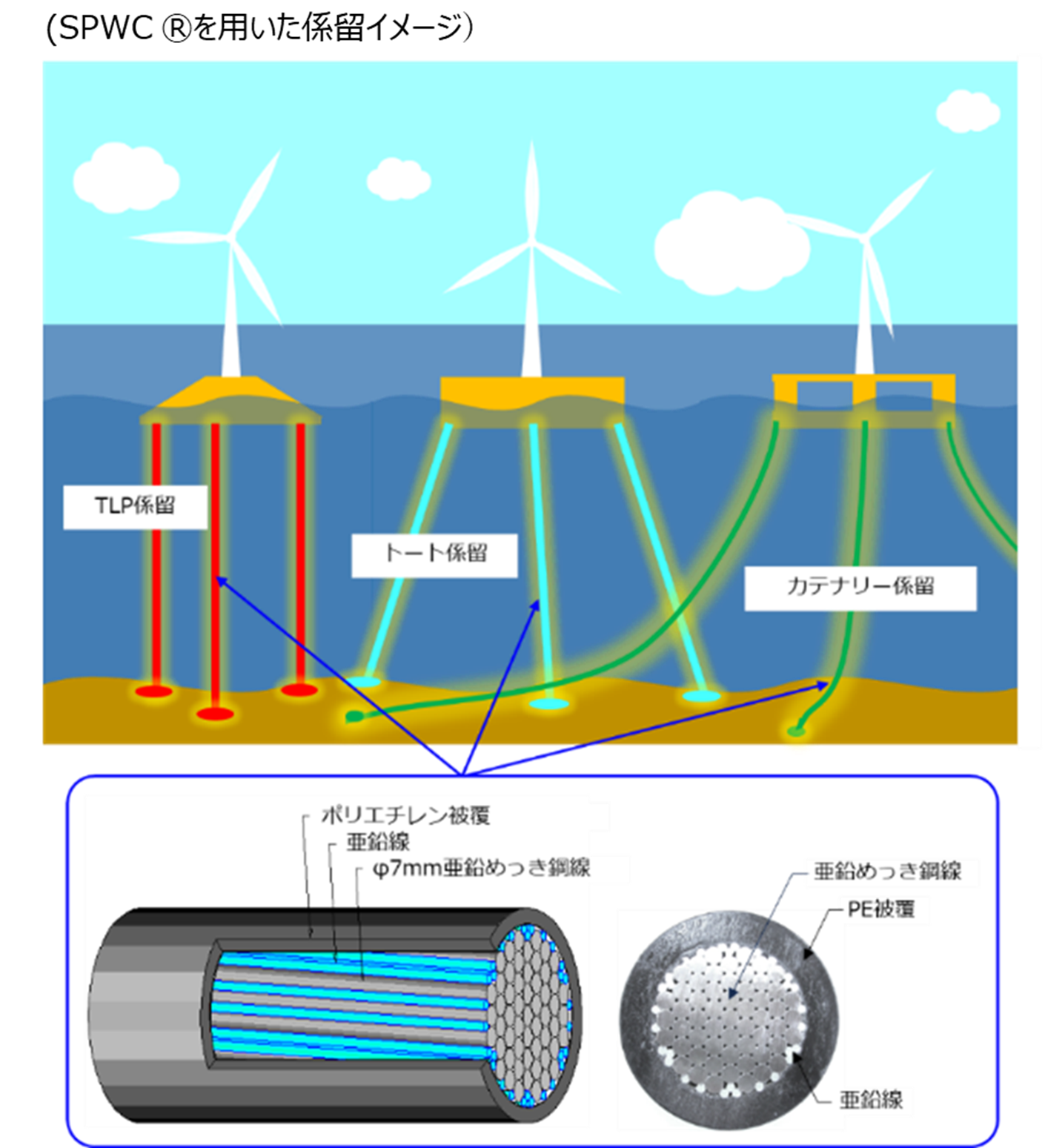 高耐食型 SPWC は、直径7mmの亜鉛めっき鋼線を束ねてポリエチレンで被覆したケーブルで、高疲労強度と優れた防食性能を有すとされています。浮体式洋上風力発電設備の浮体構造物の係留索として、鋼製チェーンや繊維ロープとは異なる物性を持ち係留方式も限定しない新たな選択肢となることが期待されています。